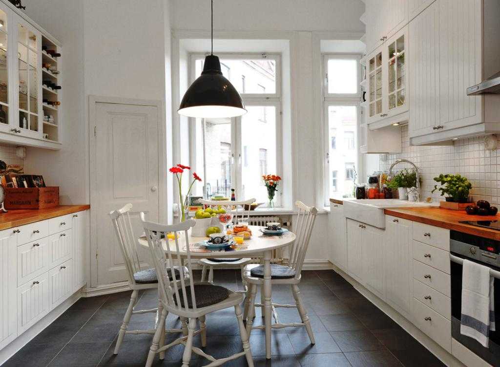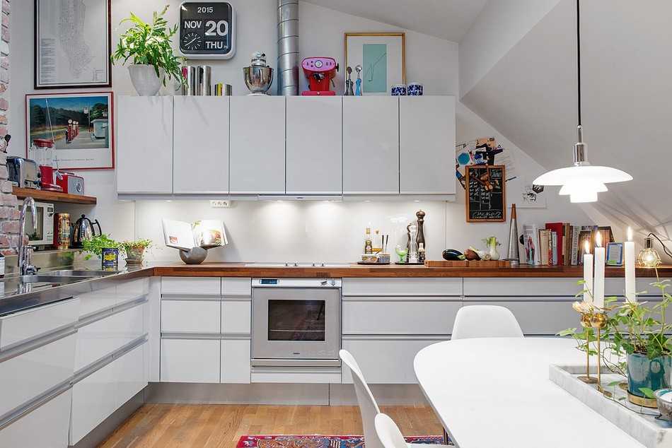 Белая глянцевая кухня с деревянной столешницей не совсем подходит для скандинавской обстановки. Лучше подбирать матовые модели, ведь стиль построен на естественности и простоте.