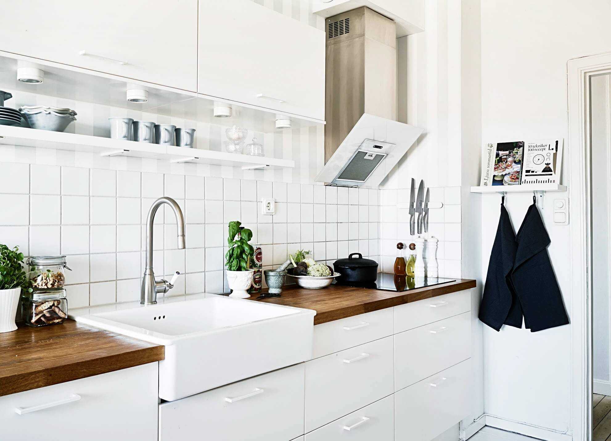 Если в вашей белой кухне столешница из дерева, фактически она становится отправной точкой в оформлении модного интерьера. Нужно грамотно подобрать все отделочные материалы, декор. При этом в первую очередь, учитывается общая стилистика, от неё зависит цвет и фактура дерева.
