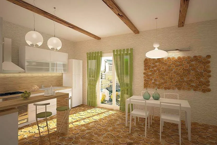 Она может быть слегка состаренной, в этом случае выигрышно смотрится пробковый пол.
