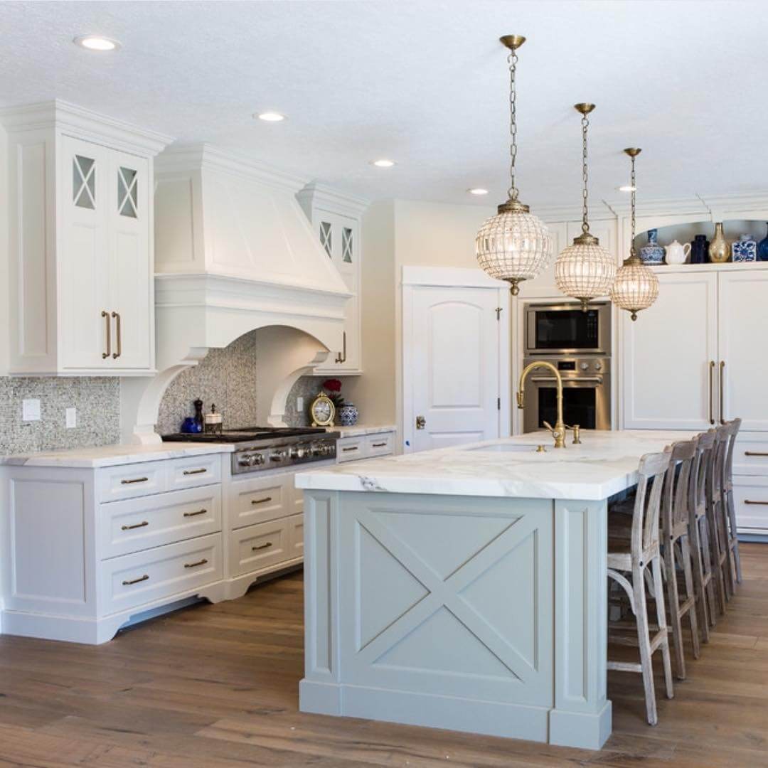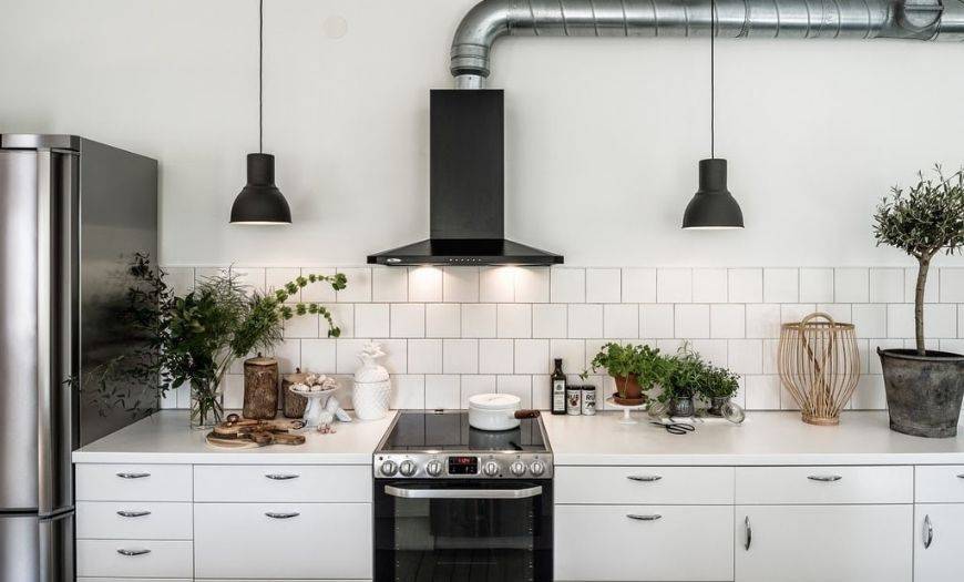Белый цвет уравновешивает и подчеркивает красоту металлов. Вы можете выбрать один-два вида металла и использовать их в оформлении кухни. Например, это может быть фурнитура кухонной мебели, детали светильника или бытовой техники, рамы зеркал/картин, сантехника.