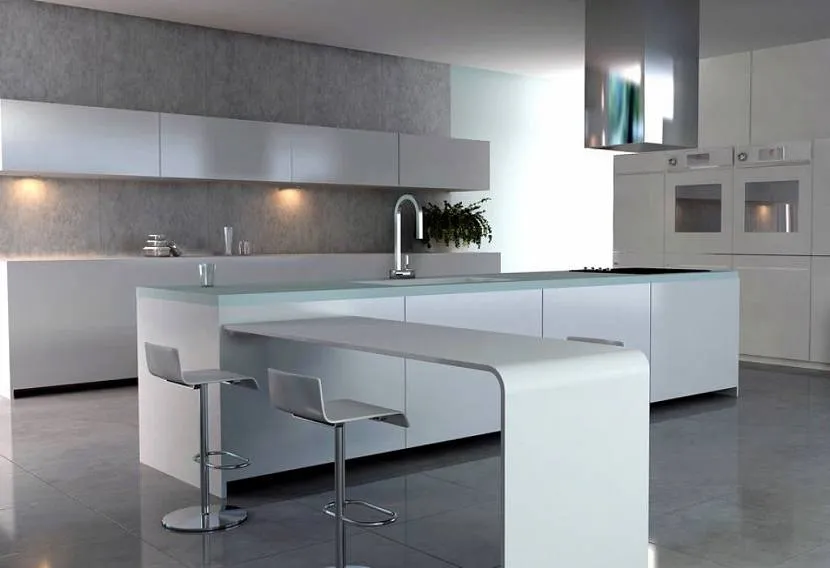 В стиле минимализм допускается смелое сочетание глянцевой мебели белого цвета с чёрным, тёмно-красным и жёлтым тоном. Главное, придерживаться золотого правила включения дополнительного оттенка. Обязательно следует украсить интерьер аксессуарами из стекла, дерева или металла. В белой кухне для отделки стен и столешницы можно использовать серую и коричневую гамму, примеры фото работ представлены в каталоге. В стиле минимализм органично впишется в интерьер столик со столешницей из стекла на хромированных ножках. В качестве акцента можно включить интересный декор – панно из зеркальных элементов.