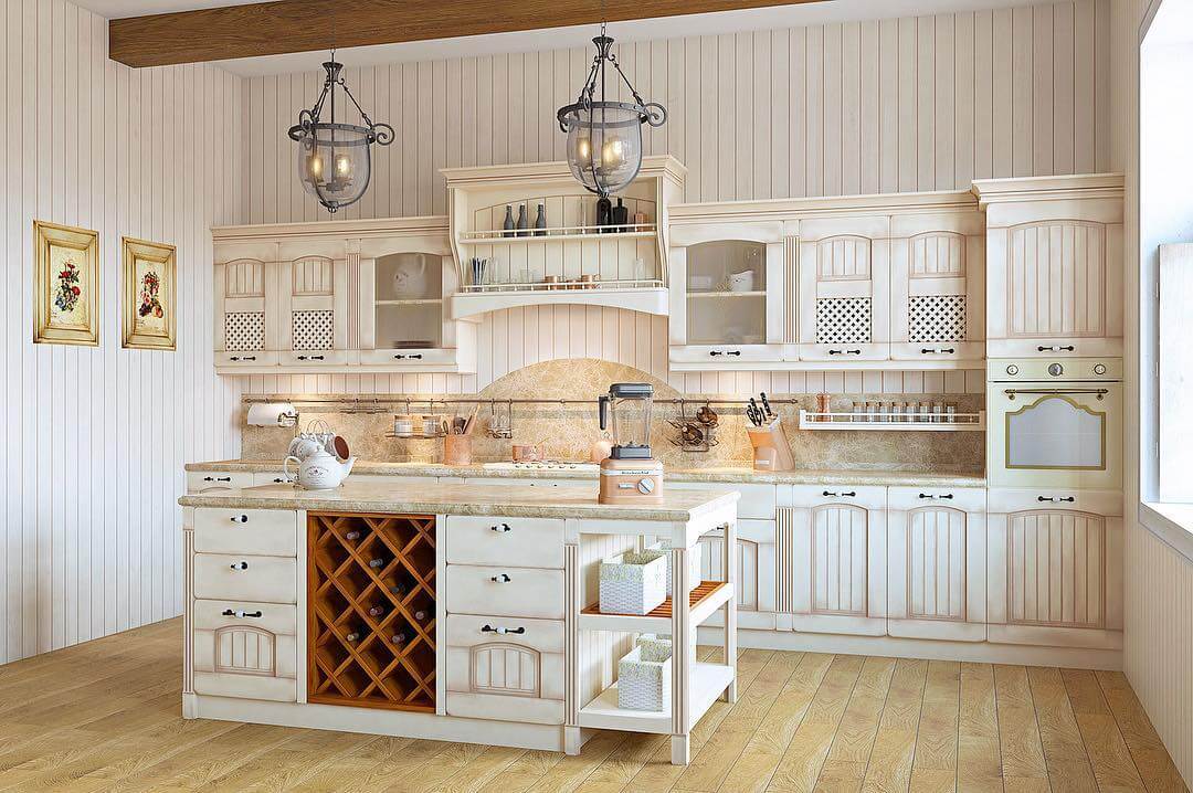 Подходящее пространство для такого выбора — просторная кухня с потолками от трех метров. Маленькая кухня может претендовать на такое оформление, только если гарнитур светло-бежевый, а стены, фартук, шторы и декор белые или отличаются от гарнитура на два — три тона.