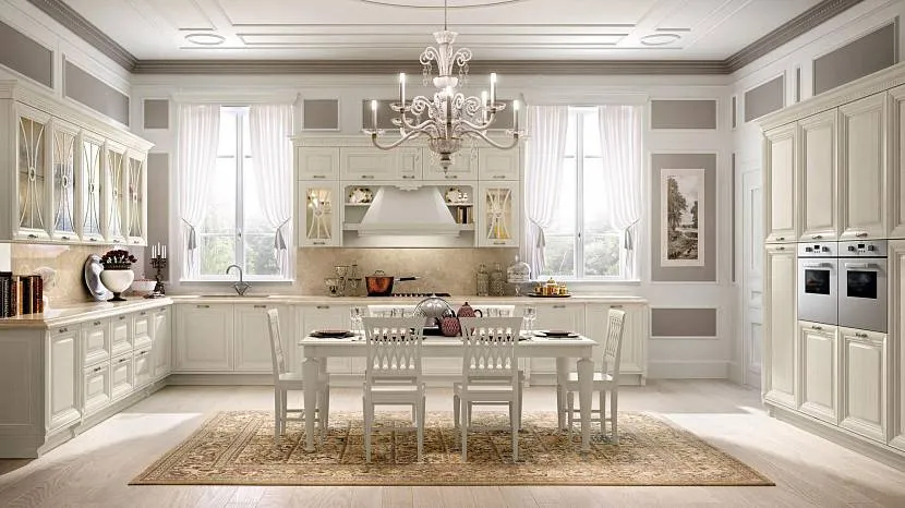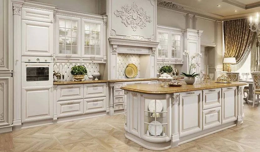 В классическом дизайне белой кухни, кроме навесных и напольных шкафчиков, уместно будет смотреться сервант из натурального дерева со стеклянными витринами, который напоминает гостям о достатке хозяев. Все фасады должны иметь глянцевую поверхность с элементами позолоты или патины, которые подчёркивают изящество классики. Ножки кухонной мебели, стульев и обеденного столика должны быть изогнутыми с элементами инкрустации. Допускается лепнина по периметру и центру потолка. В качестве декора используют хрусталь. Завершить образ классического оформления следует дорогими шторами и скатертью в насыщенной цветовой гамме.