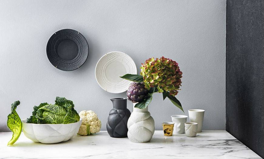 Светлые тона хорошо сочетаются с деревянными столешницами, полочками с керамической посудой, стеклом. Кроме выбора, собственно, материала очень неплохо смотрится сочетания разных текстур: глянца, камня, лепнины, натуральных тканевых волокон.