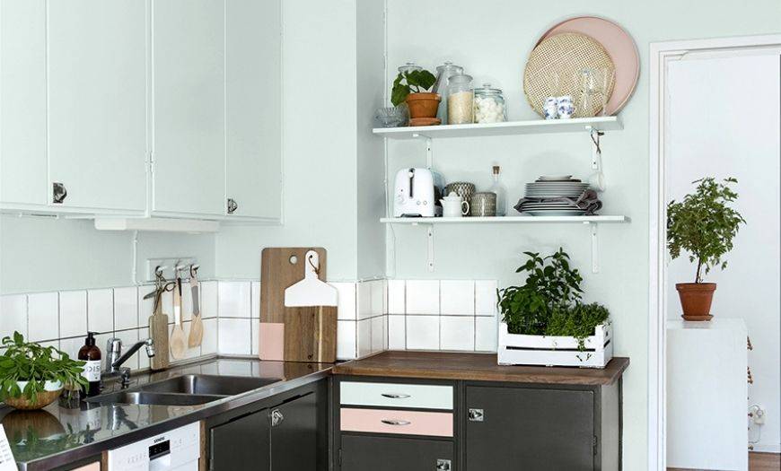 Одна часть гарнитура может быть белой, а другая – деревянной, цветной, черной или любой другой. Решение простое, не банальное и может принести много пользы. Например, одну часть шкафов можно оформить в тон стен, чтобы получился эффект невидимости, и пространство казалось менее загроможденным.