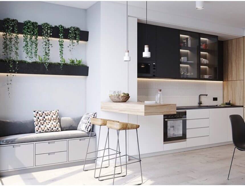 Любая кухня состоит из рабочей зоны и обеденной. В рабочую входят: поверхность для приготовления пищи, а также встроенная панель с бытовой техникой, в обеденную — стол и стулья. Возможно использование мягкого дивана. Хорошо здесь сыграть на контрасте деталей.