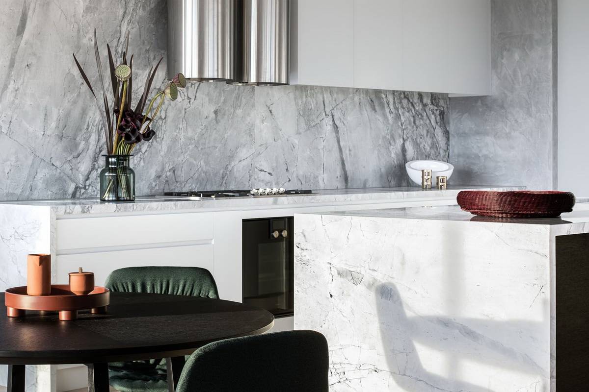 Изящное обустройство для габаритных кухонь стараются организовывать с применением фактурного натурального камня. Например, облицовывают столешницы рабочей зоны или барной стойки мрамором либо гранитом.