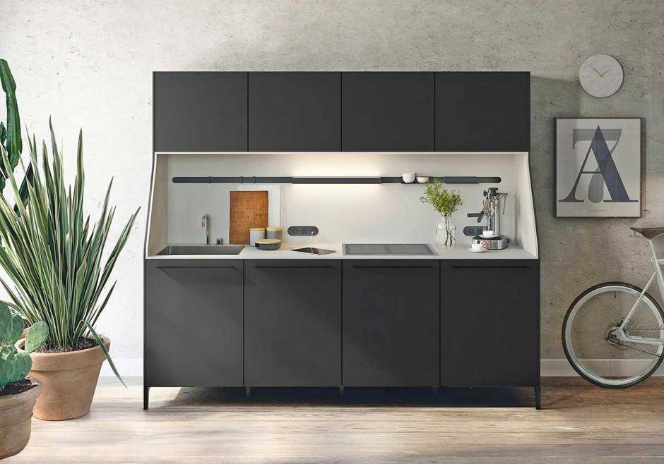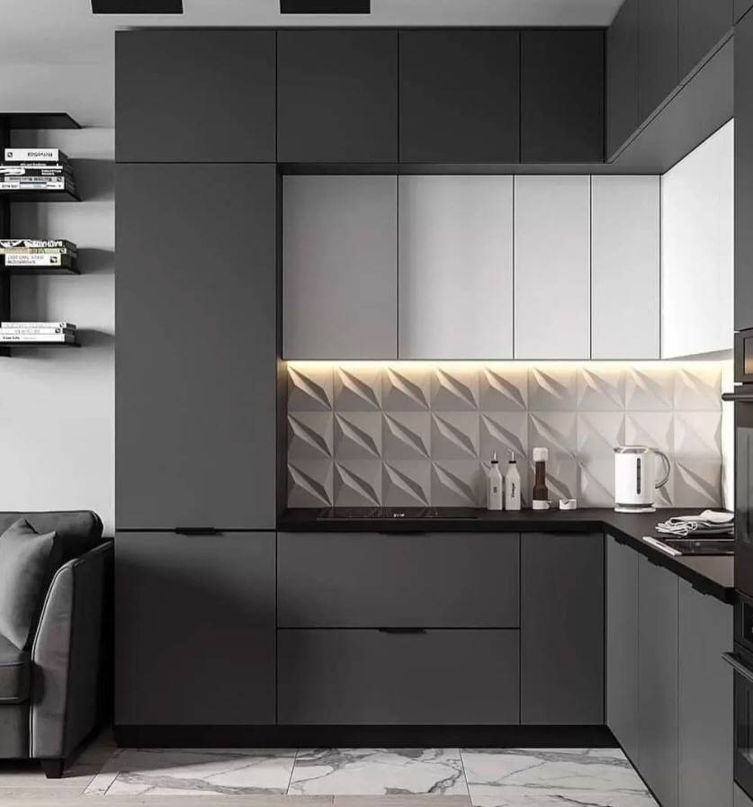 Черный цвет подходит для контрастного выделения рабочей зоны кухни. Он отлично смотрится в неоклассическом стиле в сочетании с лаконичными черными дверными ручками.