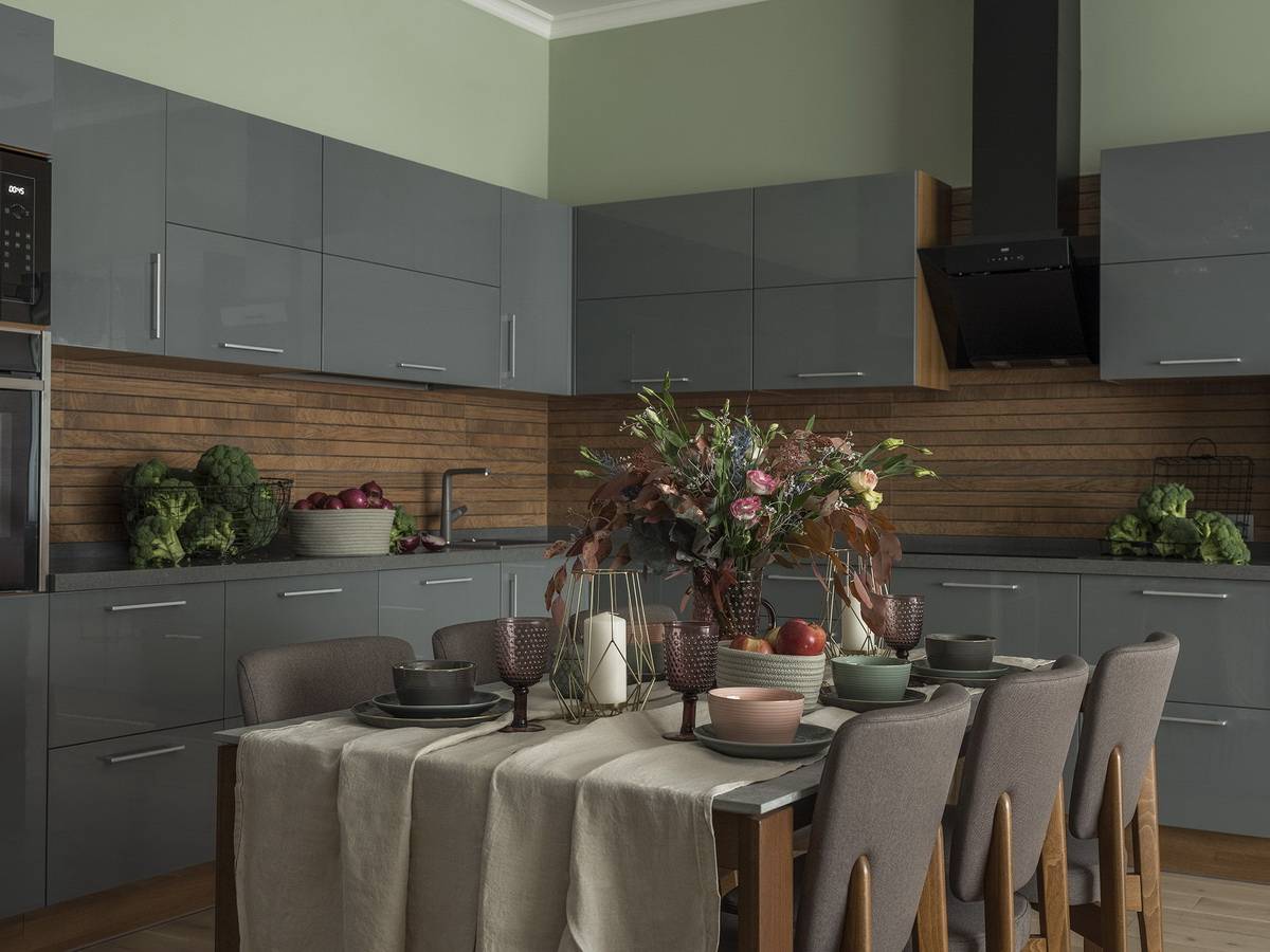 Помните о фактуре, играйте с матовыми и глянцевыми поверхностями. Модный и гламурный глянец можно дополнить блестками. Такое решение гармонично впишется в хай-тек кухню. В свою очередь, классика «предпочитает» пепельные матовые оттенки и резные детали.