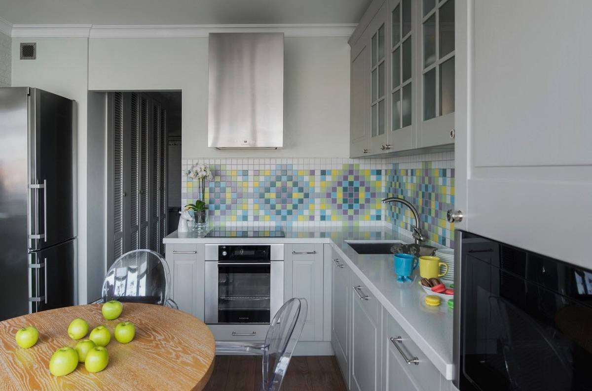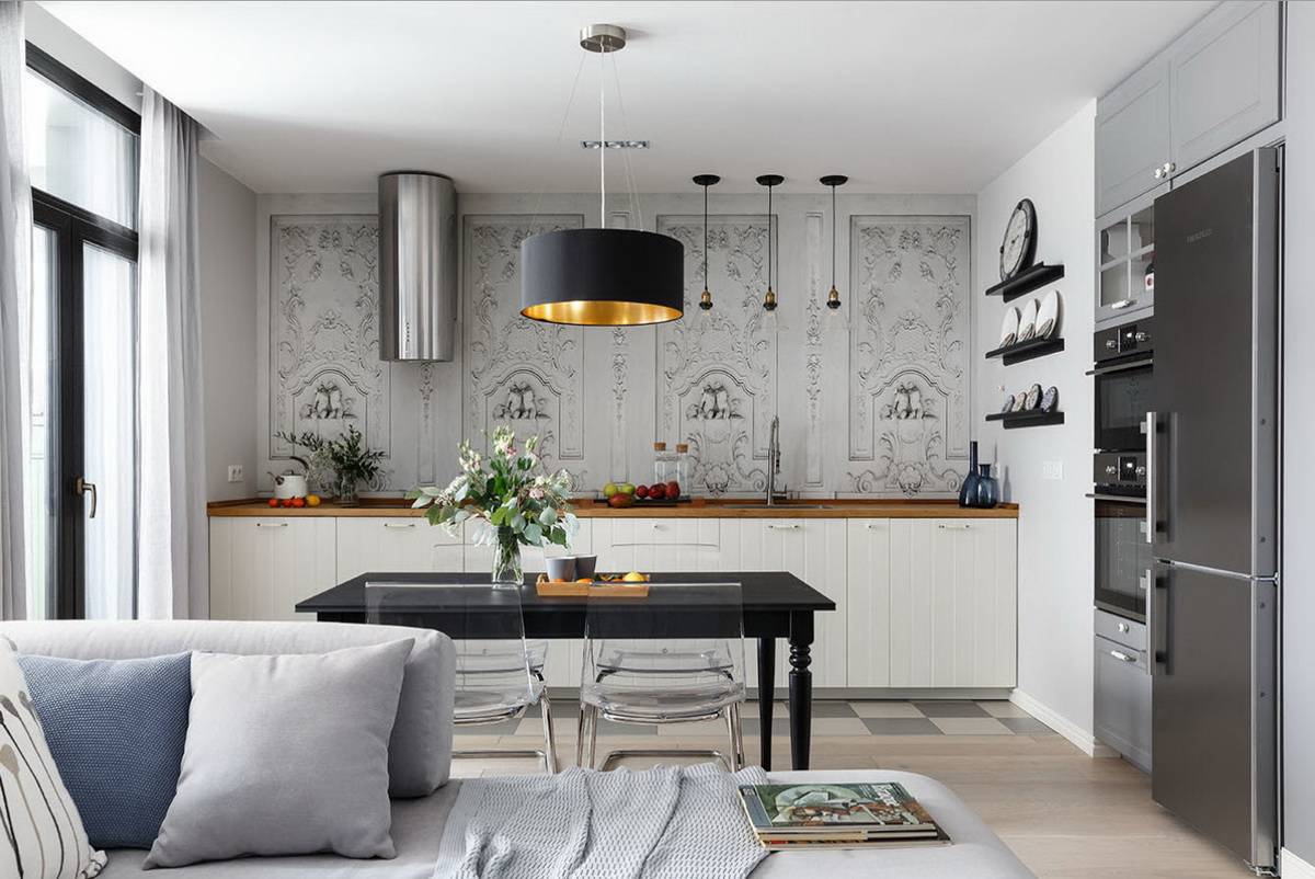 В кухне в неоклассическом стиле допускается использование контрастов. Кухонный гарнитур с простыми фасадами можно дополнить витражным фартуком и аркой, разделяющей рабочую зону и гостиную.