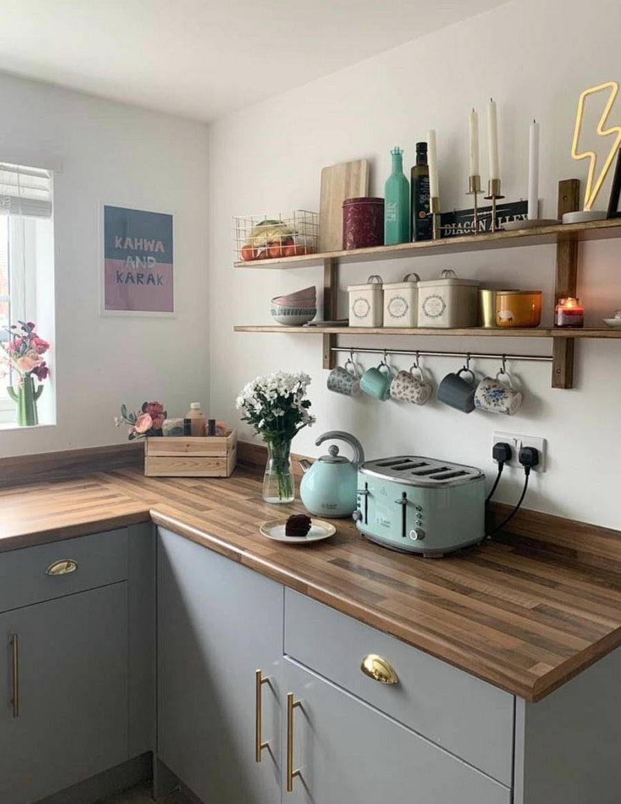 Голубая матовая краска великолепно сочетается с кухонным гарнитуром из дерева
