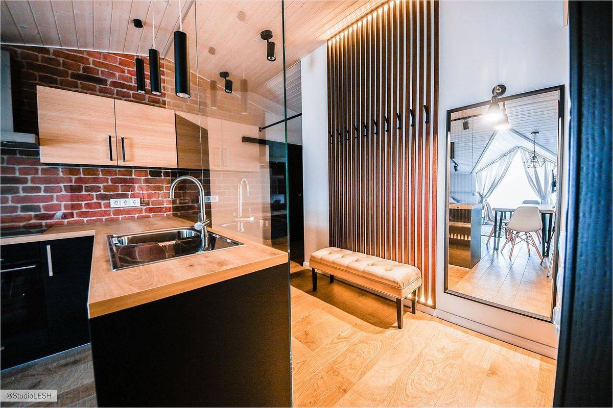 Кухня, совмещённая с гостиной и прихожей в стиле лофт