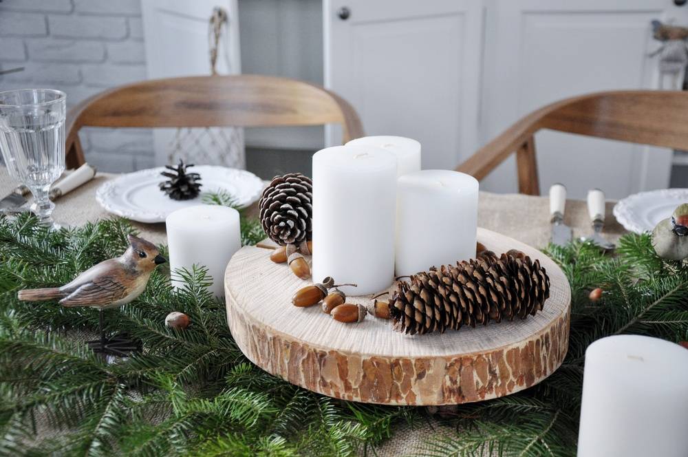 – спилы натуральной древесины в качестве подставок, свечи, ветки ели, шишки, скатерть из натурального льна или хлопка;