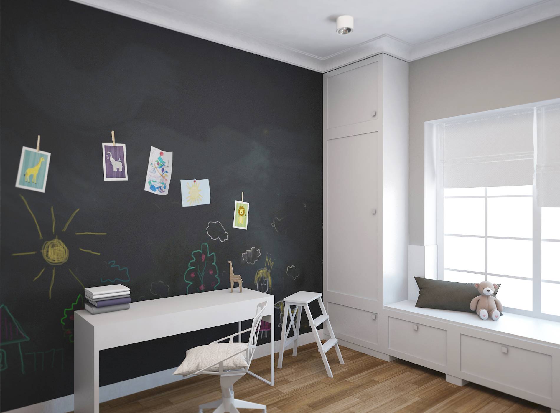 Когда ребенок вырастет и пойдет в школу, эта же грифельная стена понадобится ему для занятий: на ней будет удобно объяснить школьнику трудную задачу, потренировать написание букв и слов.