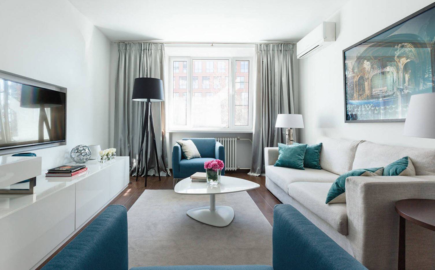 В сочетании с белым можно использовать яркие тона, которые не отвлекут внимание, но при этом сделают зал более сочным и современным. Также не стоит забывать про аксессуары и текстиль