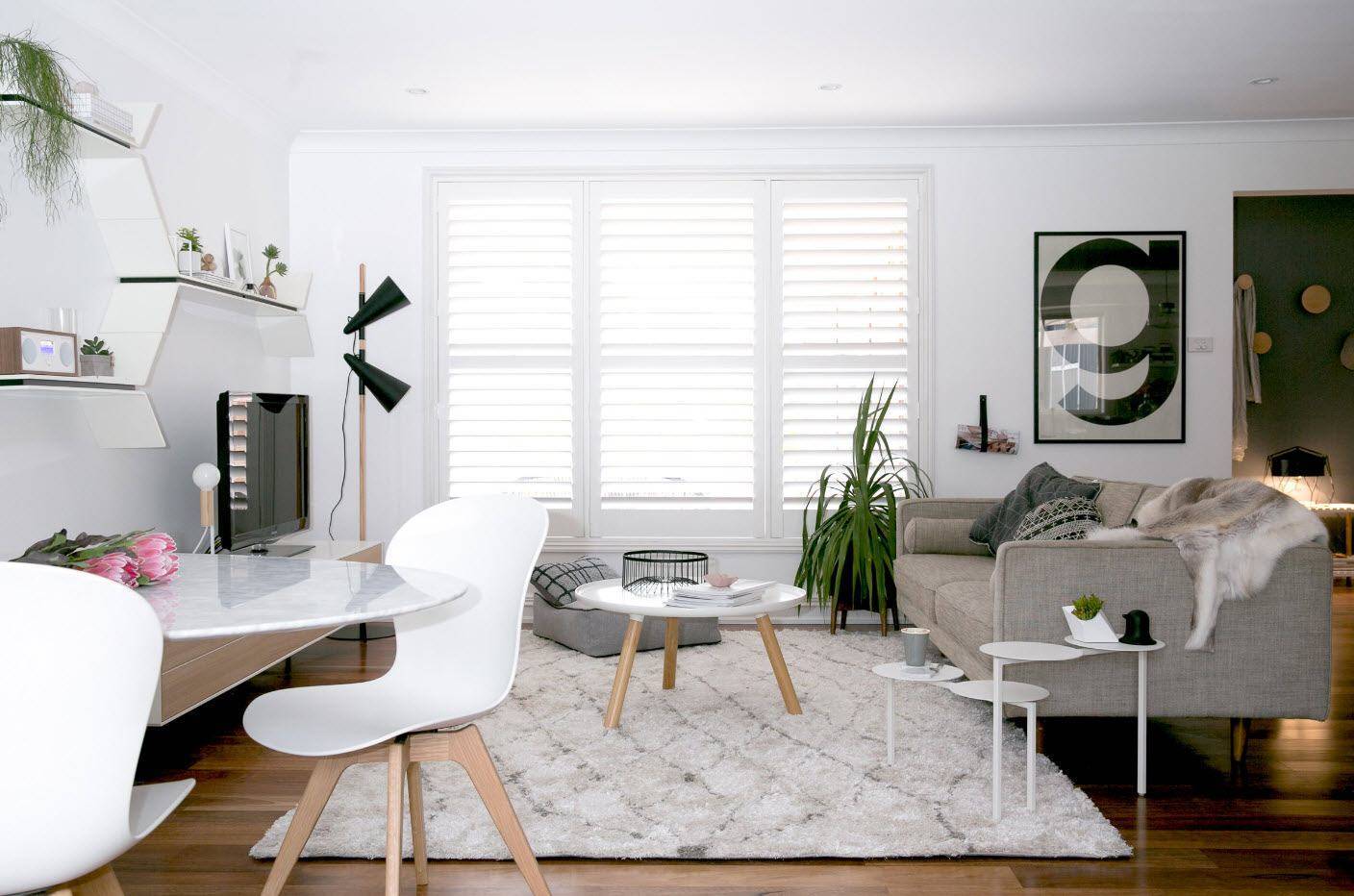 Белый цвет делает гостиную светлой и уютной