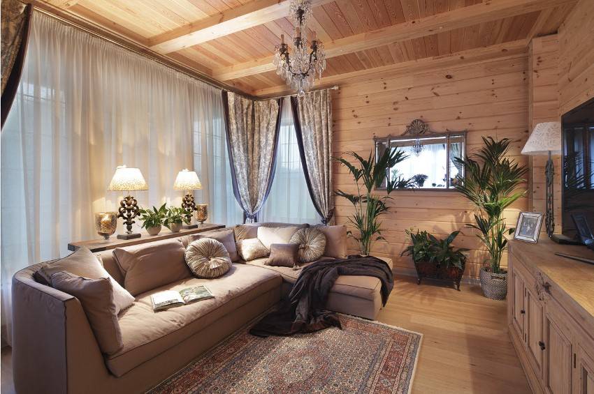 Классику можно сделать и в деревянном доме, если подобрать светлые тяжелые портьеры из бархата. Но стоит помнить о том, что такой материал требует частого ухода, особенно в условиях дачного дома.