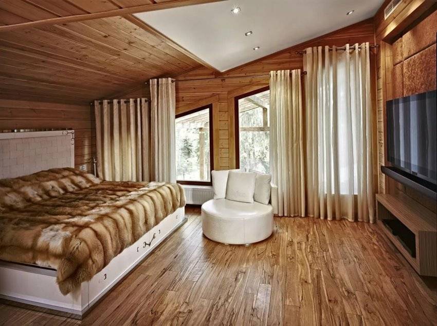 Современный стиль деревянного интерьера подчеркнут шторы из органзы и других современных материалов, которые сочетаются с цветом декоративных элементов интерьера.