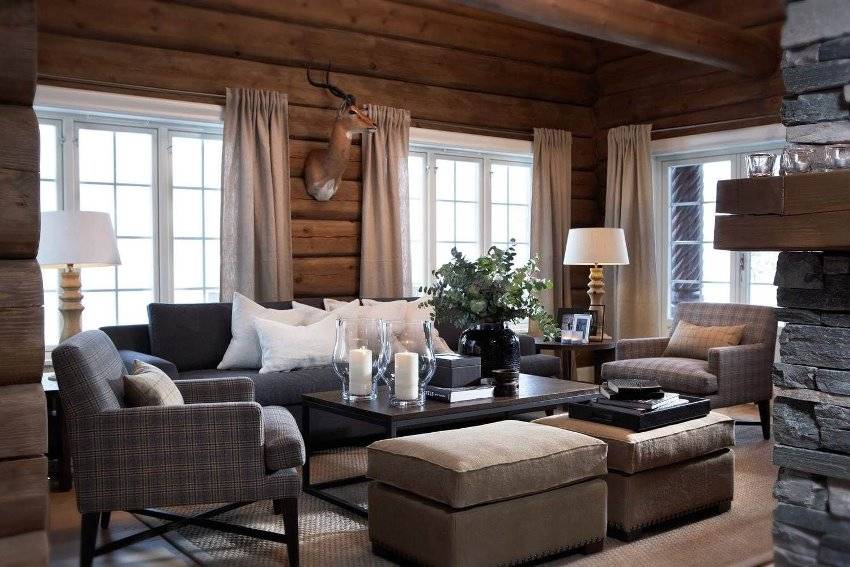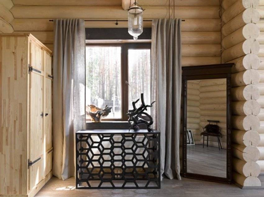 Деревянный дом за городом – это приятное место для горожанина, куда хочется возвращаться и проводить все выходные. Деревянные стены и натуральные шторы передают ощущение природы и свежести леса. Дизайн дома настраивает на расслабление, не последнюю роль играет и декор оконного проема. Органично будет сочетаться цвет штор с текстилем или обивкой мебели. Для декорирования можно взять бахрому, кисти и бантики, подхваты.