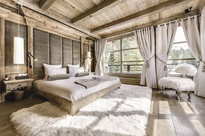 Стиль шале подойдет для просторного двухэтажного деревянного дома с окном второй свет, которые будут оформлены легкими светлыми занавесями с креплением кулиска или тесьма.