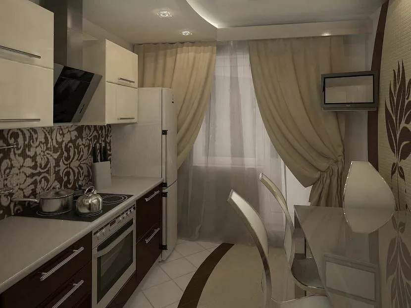 Малогабаритная кухня в доминантных цветах кофейного и бежевогоИсточник yandex.kz