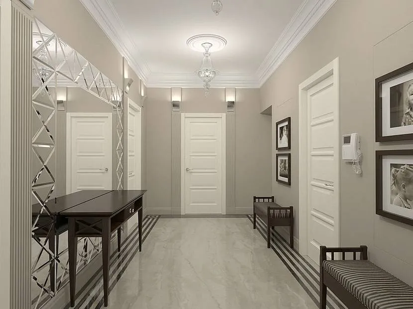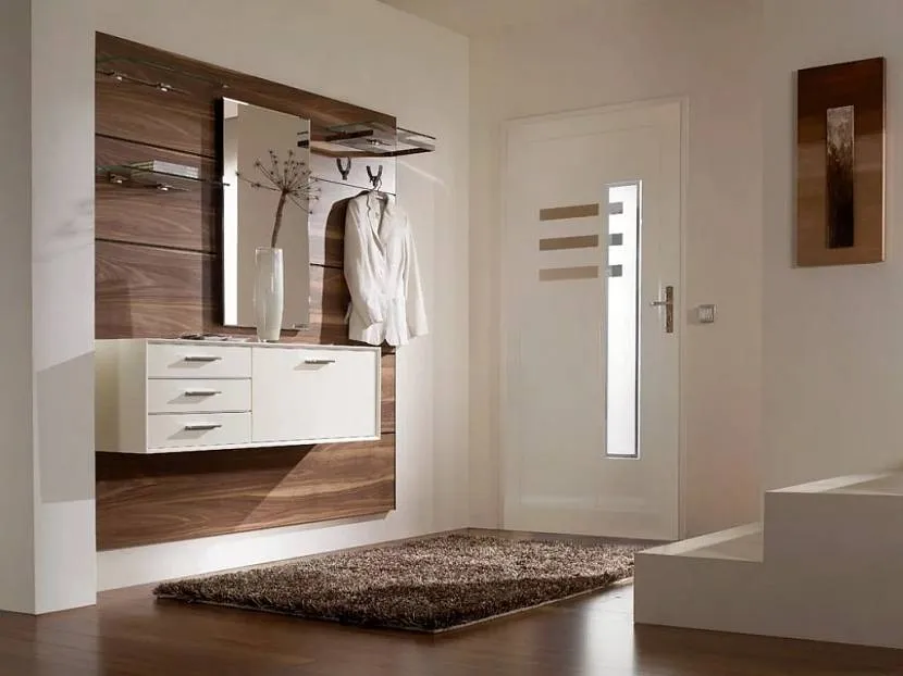 При выборе оттенка стен в прихожих можно использовать темные элементы декора.