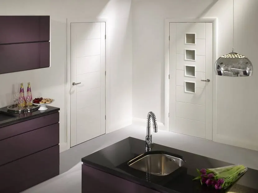 Самый простой вариант – это обычное крашеное либо облицованное ламинатом или МДФ дверное полотно. Это достаточно распространенный вариант, поскольку эти двери довольно дешевы. Их используют не только в жилых помещениях, но и в офисах. Они могут быть в виде сплошного глухого полотна или иметь вставки из матового или обычного стекла. В них могут присутствовать плавные линии и изгибы, что удачно впишется в классический интерьер, или, наоборот, лаконичность и угловатость, что позволит использовать их в стиле хай-тек или лофт.