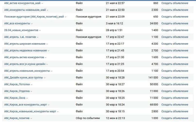 - Аудитория конкурентов (спарсила всех участников групп конкурентов и почистила базу от ботов)