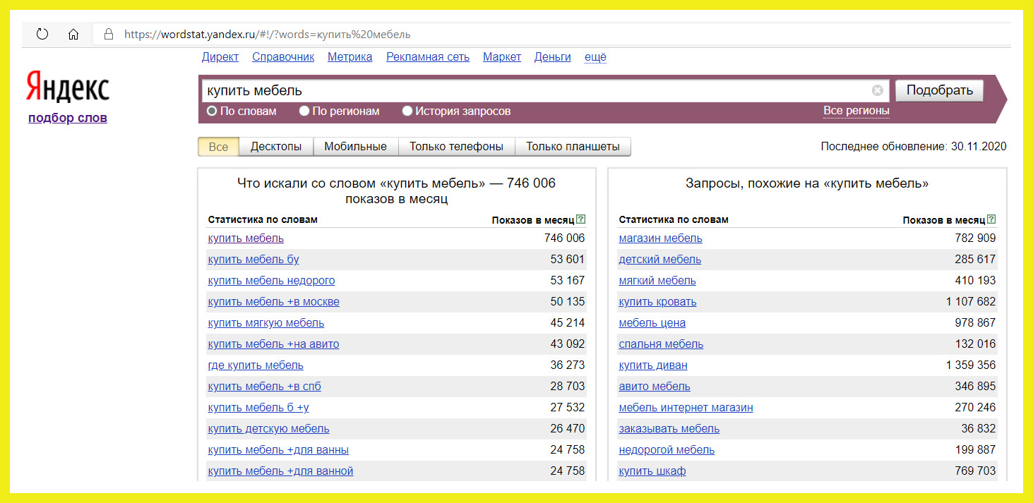 Яндекс.Вордстат — бесплатный сервис для сбора ключевых фраз