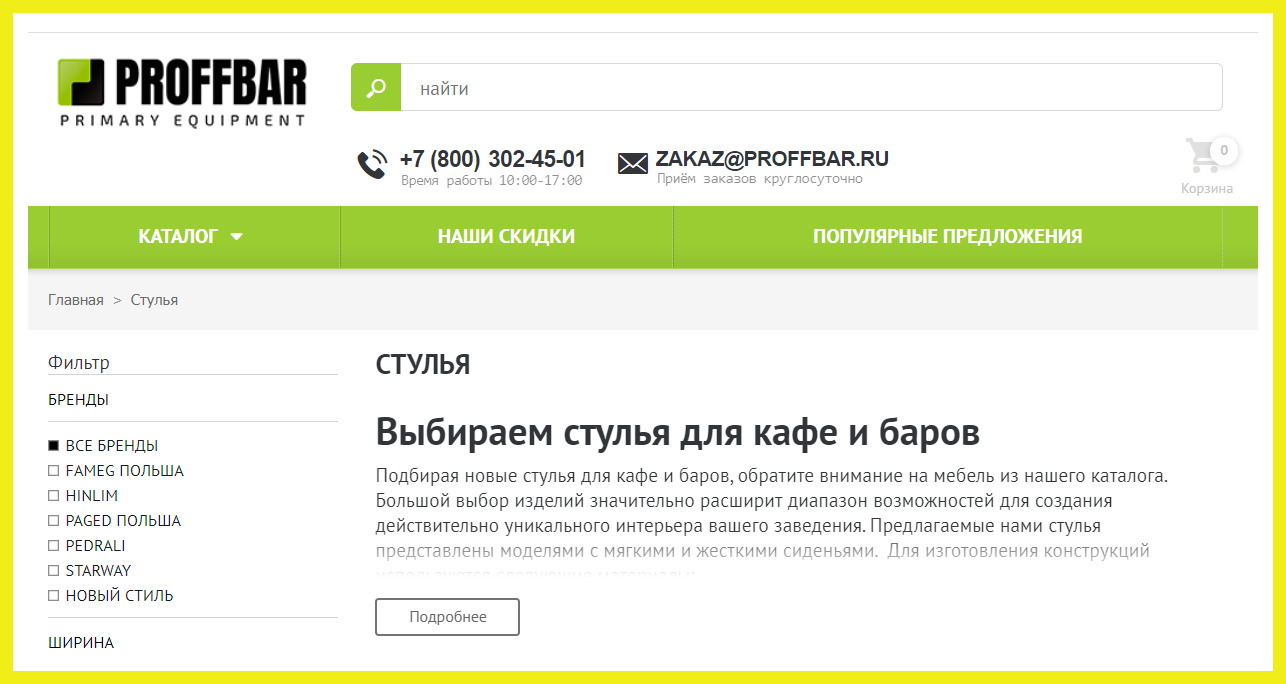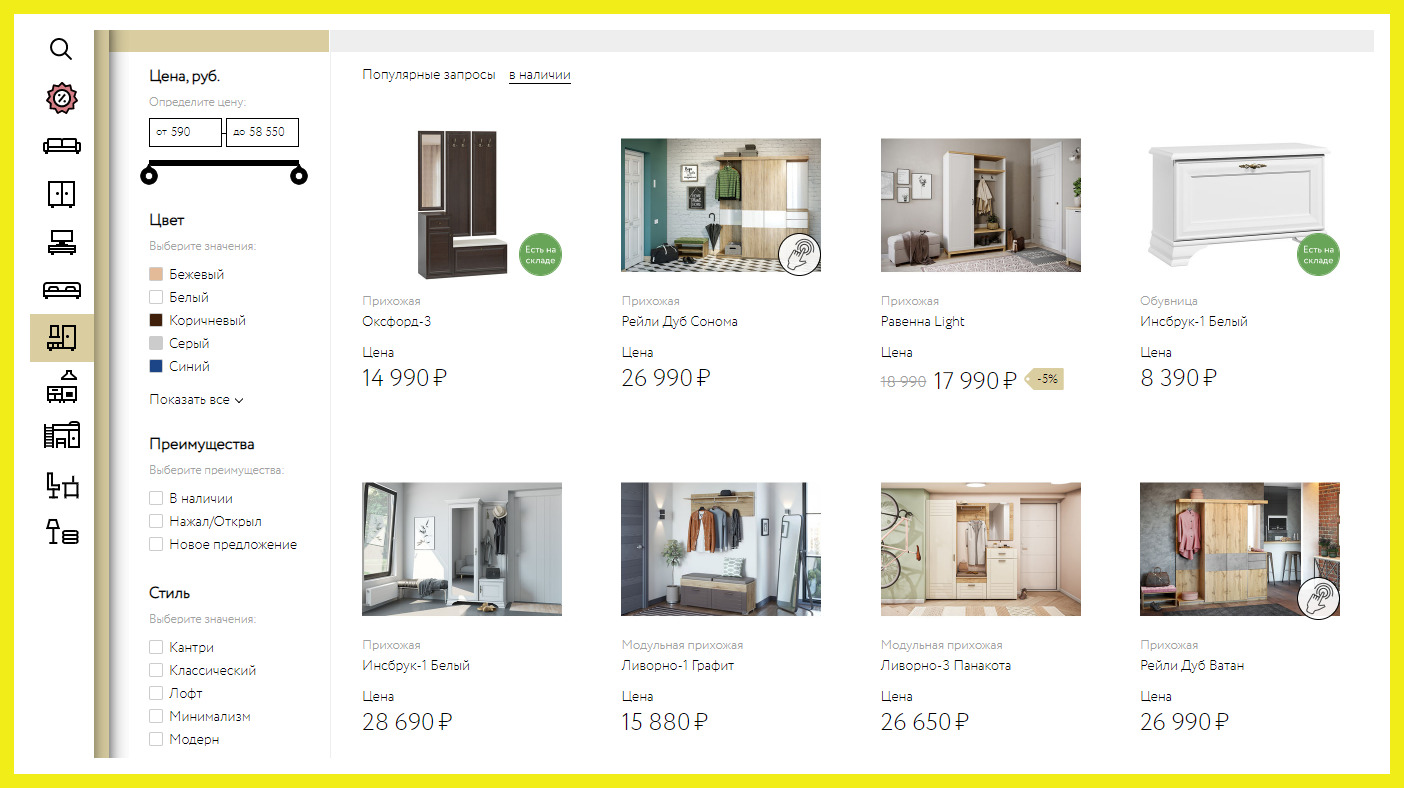 2. Оптимизировать каталог. Для этого нужно изучить структуру сайтов конкурентов и разветвить свою, чтобы охватить как можно больше запросов. Организовать фильтры для поиска товаров по назначению мебели, цвету, материалу, стоимости. Выделить категории популярных товаров, мебели со скидками, новых коллекций.