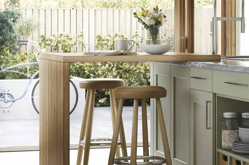Барная столешница для завтрака – лучший друг для сохранения пространства. Она образует дополнительный уголок для приема пищи или общения. Под нее можно задвигать барные стулья, когда они не используются.