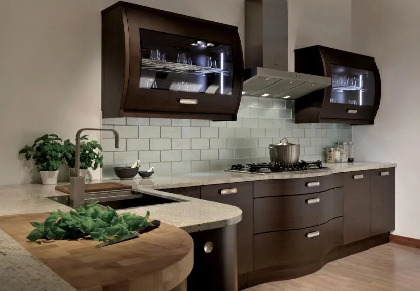 Увеличить впечатление от кухонного дизайна венге могут хромированные плоскости или матовые вставки из стекла. При облицовке хороши все материалы, которые выделят природное величие благородной древесины – природный камень, соединение с противоположными по цвету древесными породами.