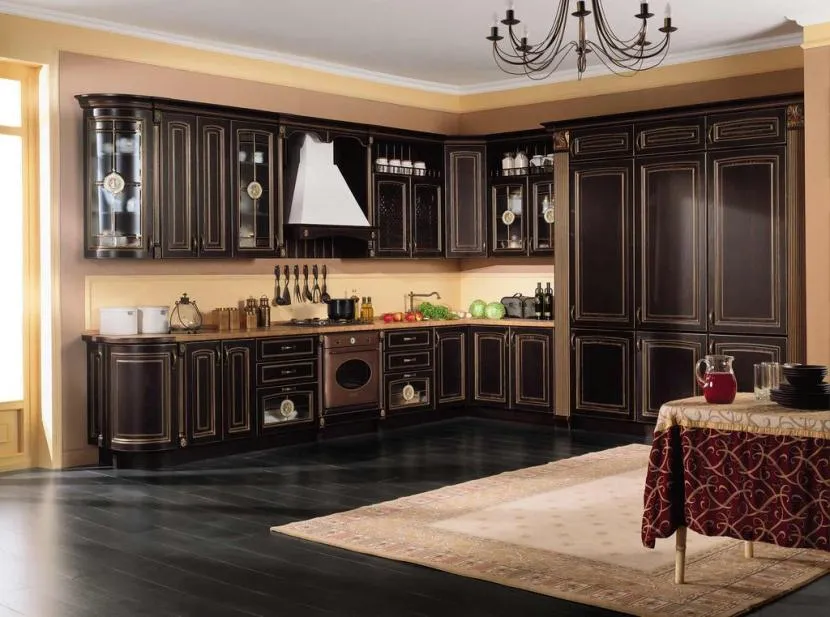 При большой кухне, можно дополнить кухонный гарнитур деревянной отделкой пола или стен, главное, темные оттенки в интерьере лучше минимизировать, иначе помещение будет казаться мрачным.