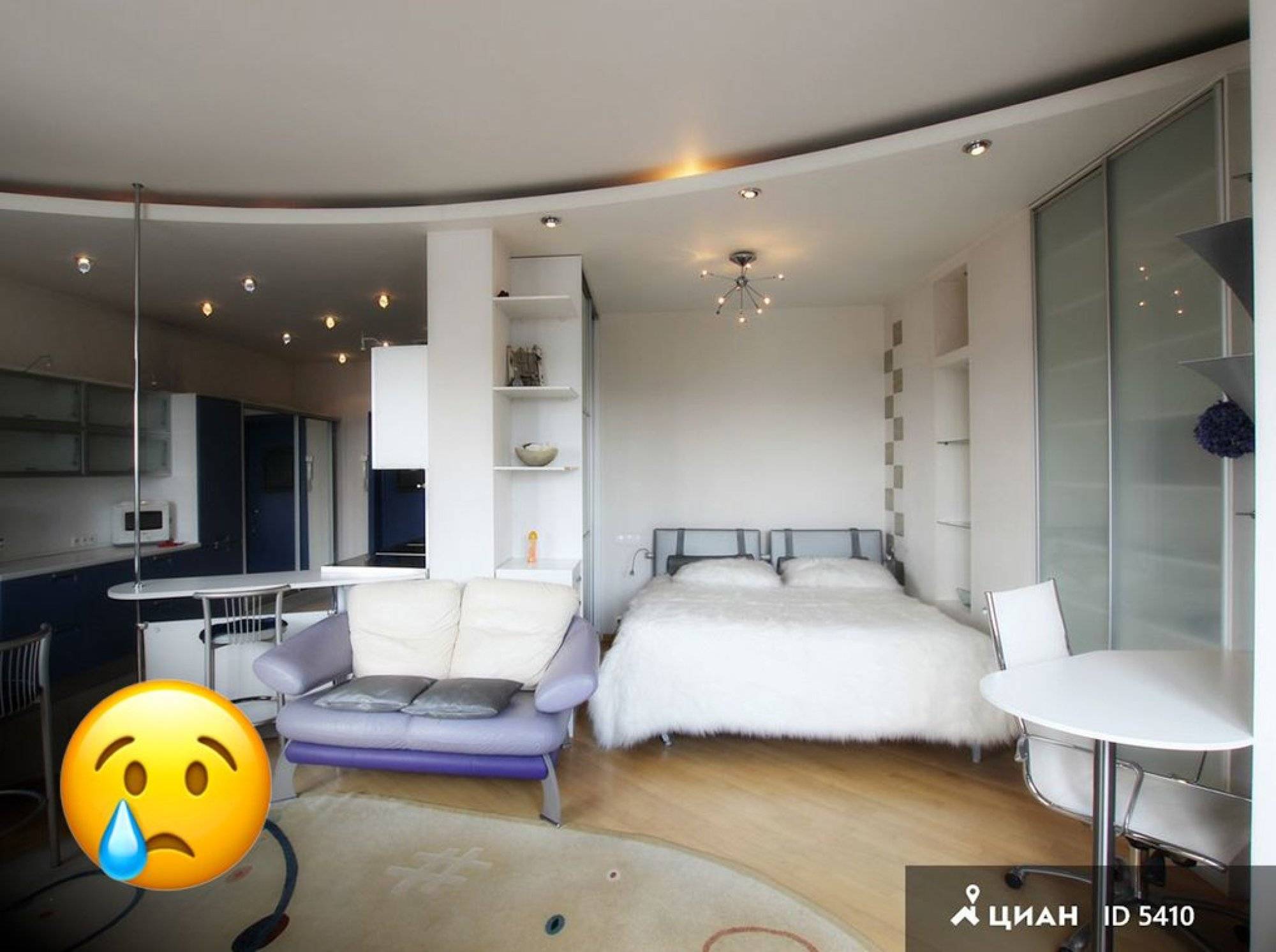 Вот он – идеальный пример всех примеров! В одной комнате все: диван и кровать в миллиметре друг от друга, барные стойки, шкафы-купе, и, конечно, (куда же без них) гипсокартон, натяжной потолок и точечные светильники! Ну очень перегруженный всем дом!