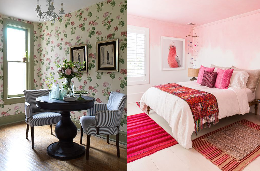 Розовый цвет тоже не под запретом, в моде и его припыленная и сочная барби-версия. Но не всё сразу: сочетание розовых стен и дивана с цветочной обивкой может стать фиаско. Но даже оно не будет слишком приторным, если диван вы выберете минималистичной формы, без дополнительного декора, а цветовую гамму разбавите нейтральными оттенками.