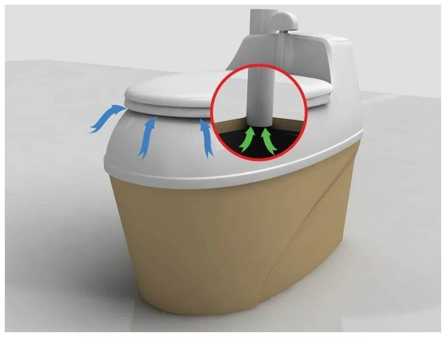 При посещении человеком такого биотуалета отходы попадают в нижний бак благодаря гравитации, а после этого посыпаются торфом. Благодаря действию этого вещества жидкость подлежит прохождению через процесс очищения и фильтрации, частично испаряясь через вытяжку. Что касается твердых остатков, то они остаются на месте и постепенно перегнивают, превращаясь в подкормку для огородных растений.