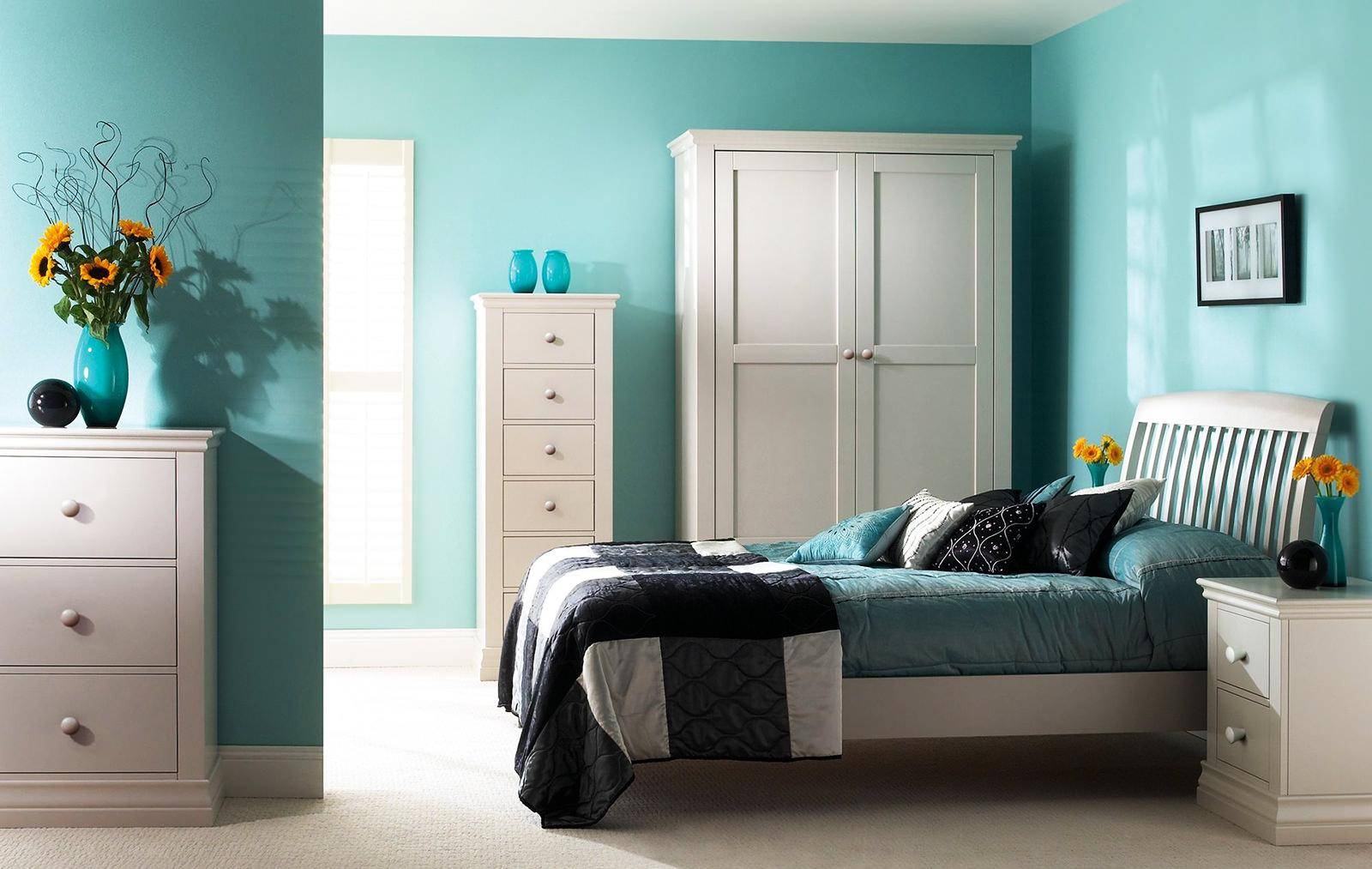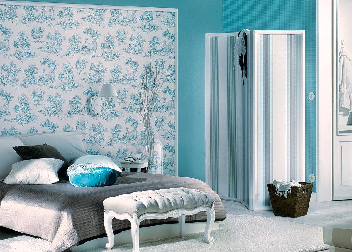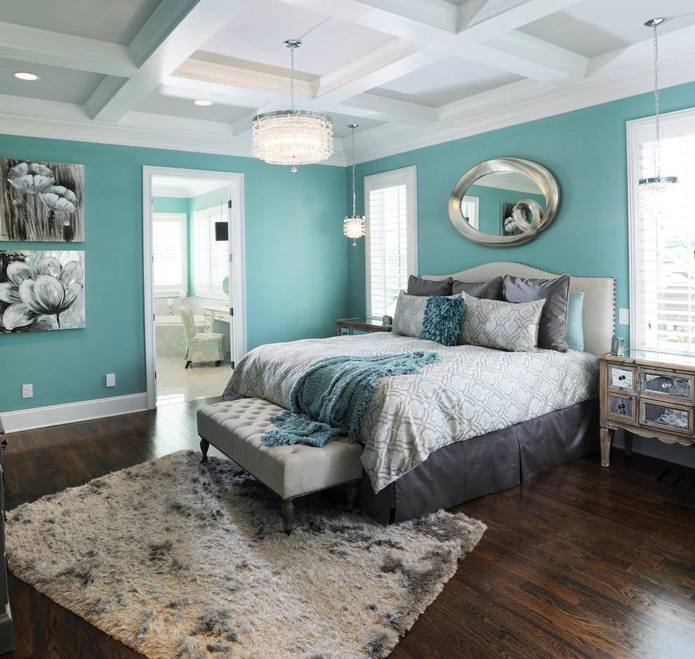 Небесно-голубой оттенок бирюзового в интерьере спальни