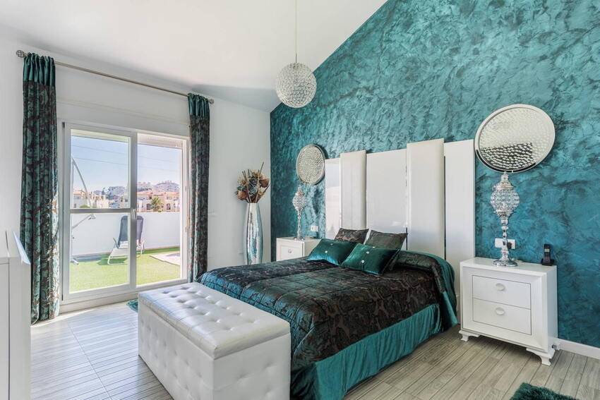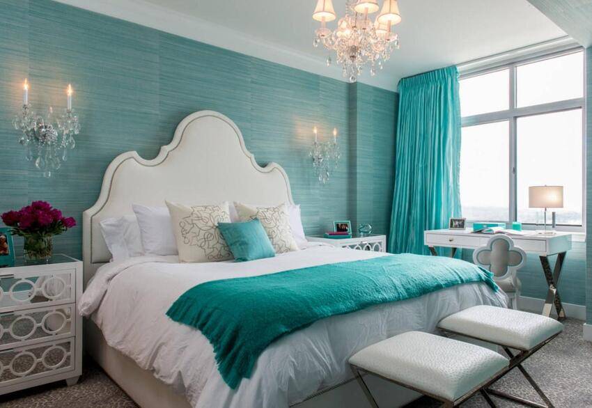 В спальне бирюзовый обычно используется для оформления стен. Их можно покрасить или оклеить обоями, выполненными в этом цвете. Бирюзовый может использоваться локально, для оформления акцентной стены, и более масштабно, затрагивая несколько поверхностей.