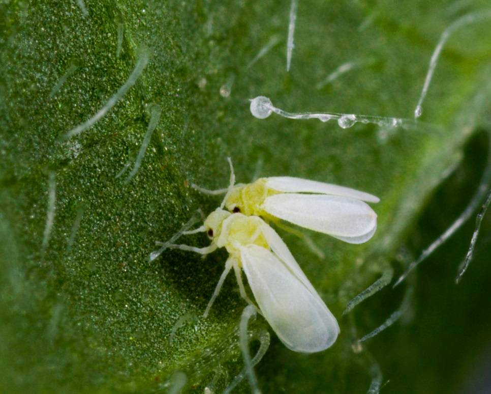 В посадках баклажан можно увидеть скопления этих мелких летающих насекомых. Они собираются на нижней части листьев овощей. Эти вредители (взрослые особи и личинки) питаются соком растения, сильно ослабляя его. При большом скоплении они могут привести к гибели.