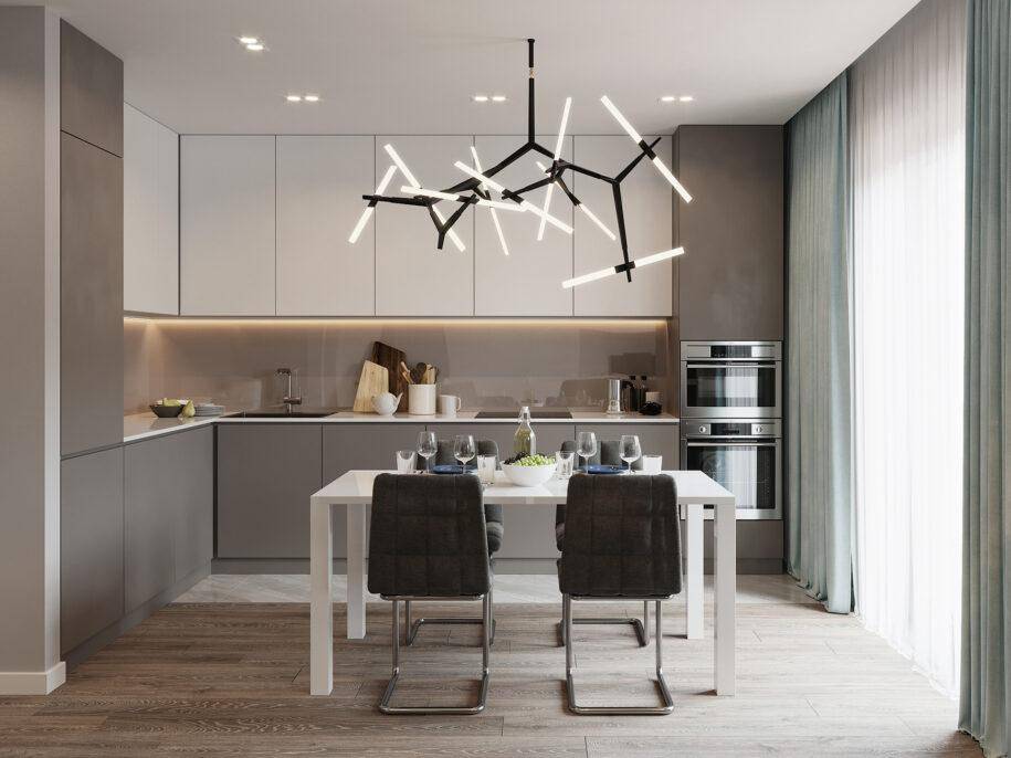 Для разграничения маленькой кухни и гостиной в стиле минимализм прекрасно подойдет барная стойка с простыми стульями. Такой вариант зонирования не только разделит пространство на чёткие участки, но и создаст оригинальную акцентную деталь. Чтобы подчеркнуть место для готовки, можно использовать контрастный фартук или точечное освещение.