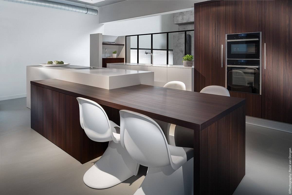 Тёмная древесина отлично подходит для создания классических роскошных образов. В этом интерьере тёмные элементы контрастно выделяются на фоне более ярких столешниц.