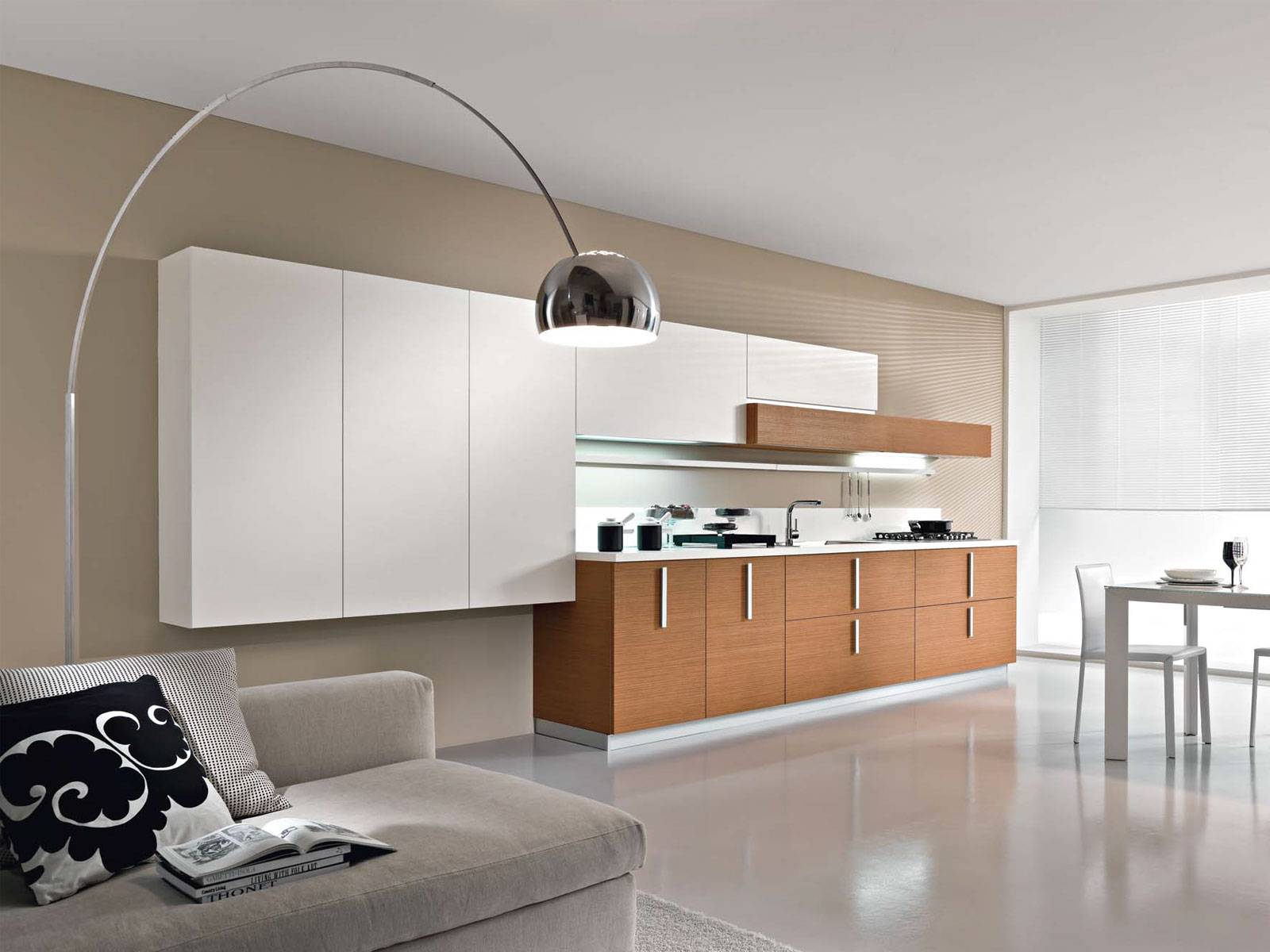 Интерьер этой кухни демонстрирует оригинальное использование деревянных элементов. Два монолитных модуля слева особенно интересны: они вплотную прилегают к узким перегородкам белого цвета. Соединённые горизонтальной панелью из дерева, они отделяют кухню от гостиной, но при этом не препятствуют проникновению дневного света.