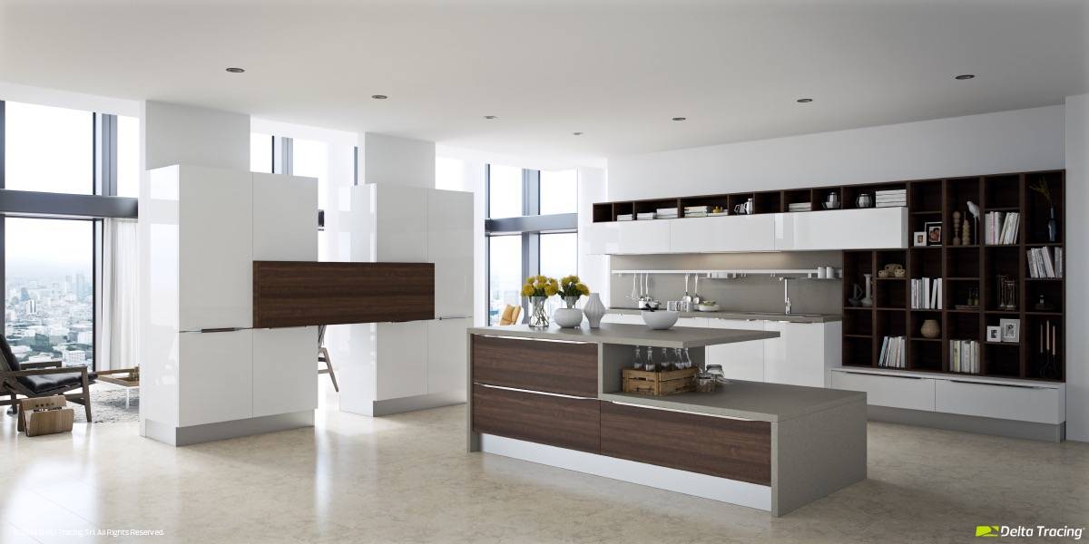 Кстати, дерево не обязательно должно быть в своем родном цвете. Окрашенный, например, в светло-серый тон деревянный потолок, сохранит главный акцент на светлой деревянной столешнице, но в то же время не будет сливаться с общей белизной стен и мебели.