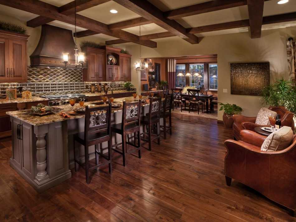 Мебель из темного дерева будет гармонично дополнять интерьер кухни