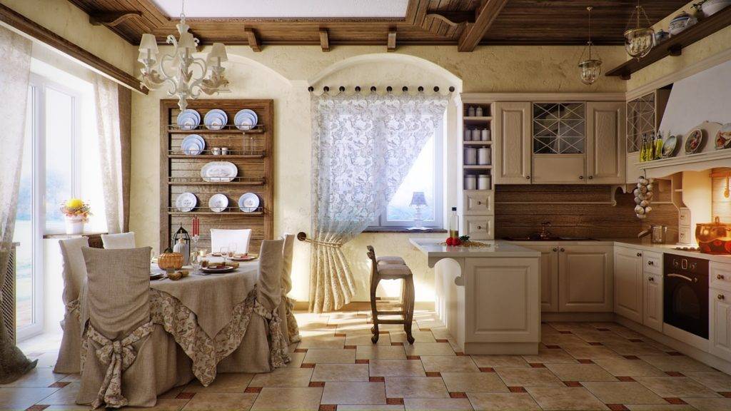 Это деревенский и в то же время изысканный стиль, привлекающий простотой и натуральностью. Для него характерна светлая палитра цветов, цветочные принты, орнаменты, эффект старения мебели, керамическая посуда.