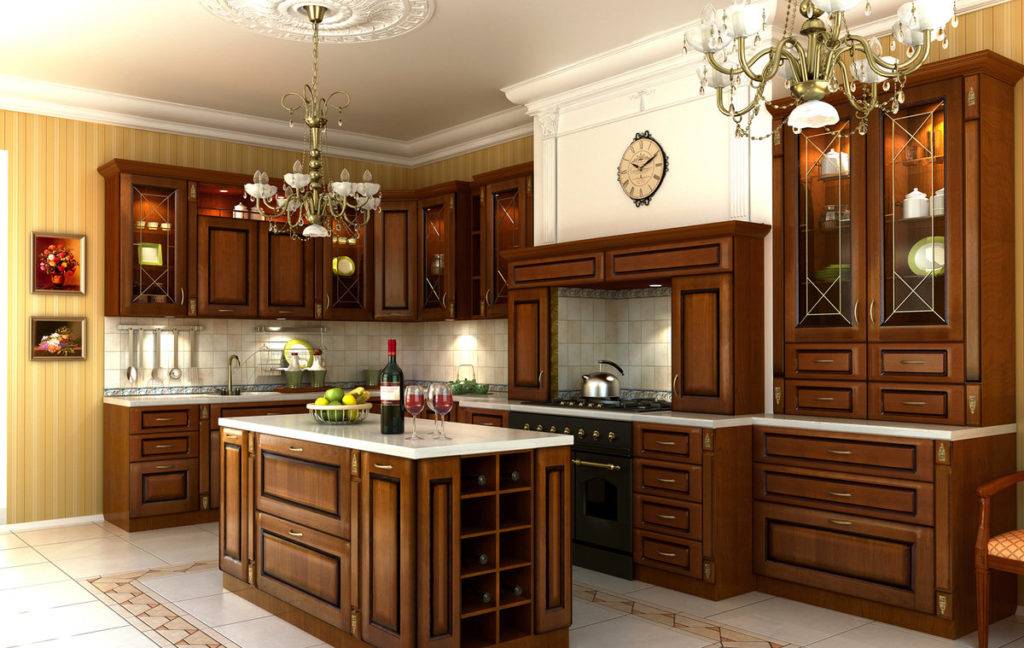 Материалы предпочтительны здесь из натурального дерева. Чаще всего это массивная мебель, поэтому маленькие кухни не рекомендуется оформлять в классическом стиле.