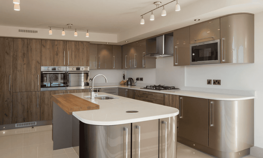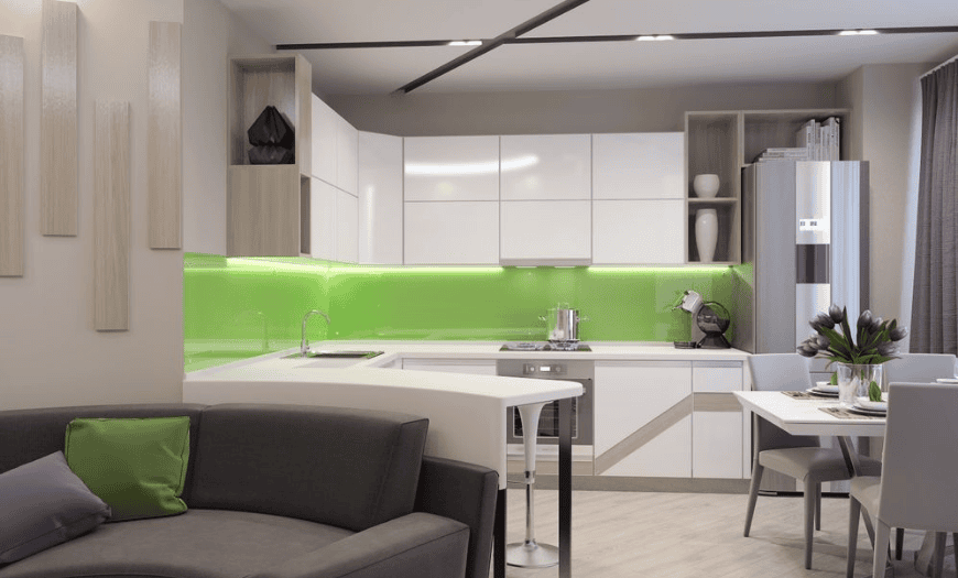 В 2023 году будет актуальным дизайн маленькой угловой кухни с полукруглой барной стойкой. Она может заменить полноценный обеденный стол. Внизу полукруглой барной стойки располагают функциональные шкафы.