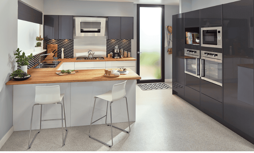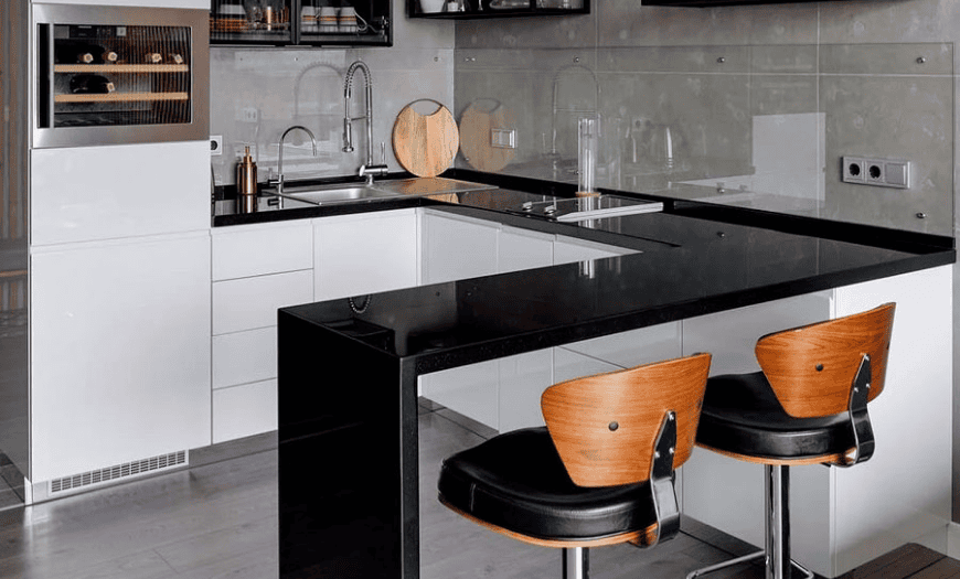 Если правильно спланировать П-образную кухню, то она будет вместительной и практичной. Такой вариант подразумевает расположение мебели и бытовой техники вдоль смежных стен. В маленьких кухнях дизайнеры предлагают установить вдоль одной из боковин гарнитура полуостров или барную стойку.