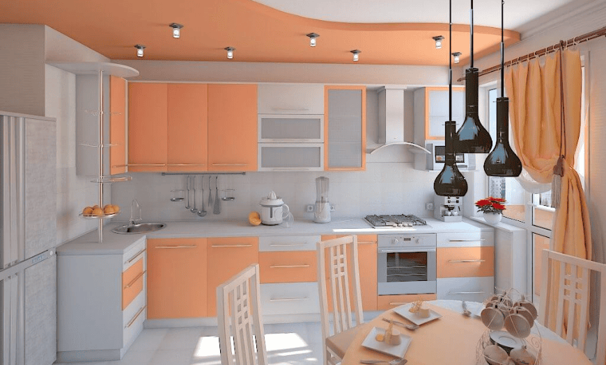 При этом перепады уровней не должны быть большими. Стык потолка и стен следует украсить потолочными плинтусами из полиуретана или гипса. Накладные элементы в виде лепнины можно использовать, если помещение кухни просторное, а сами потолки — высокие.