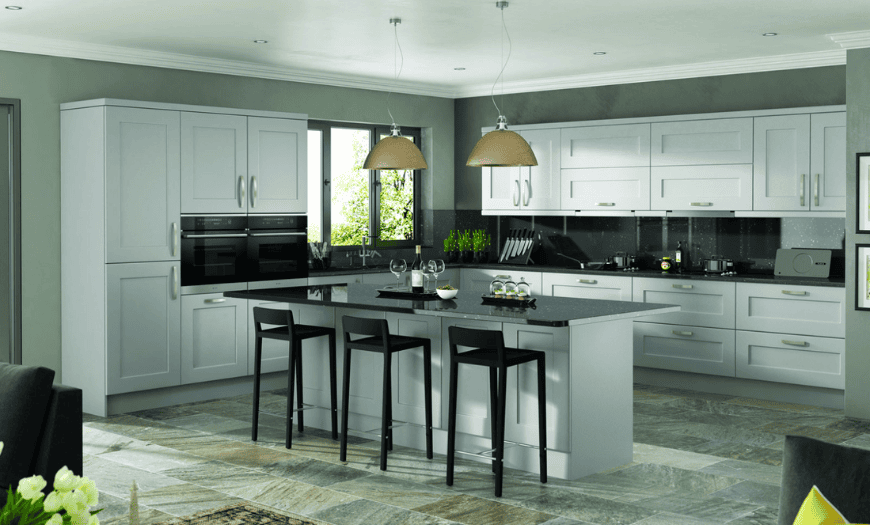 Подойдет матовый гарнитур с филенчатыми или гладкими фасадами. Глянец в скандинавском используют редко.